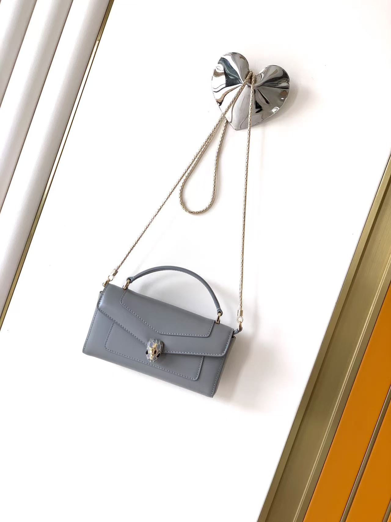 ブルガリ ハイブランドのセルペンティトップハンドルバッグは、ブランドを象徴するヘビモチーフの金具が印象的で、エレガントな存在感を放つデザインです。落ち着いたグレーカラーはどんなコーディネートにも自然に馴染み、上品で洗練された雰囲気を演出します。しなやかで滑らかな素材を使用し、細部まで丁寧に仕上げられた縫製が上質感を際立たせます。トップハンドルに加えチェーンストラップも付属しており、手持ちとショルダーの2WAYで使える実用性の高さも魅力。コンパクトながら必要な小物をしっかり収納でき、日常使いからフォーマルシーンまで幅広く活躍する万能な一品です。