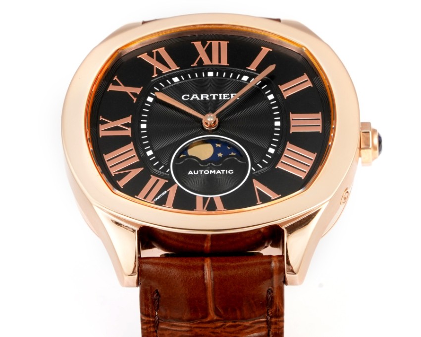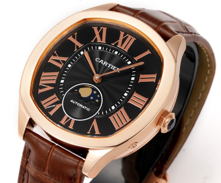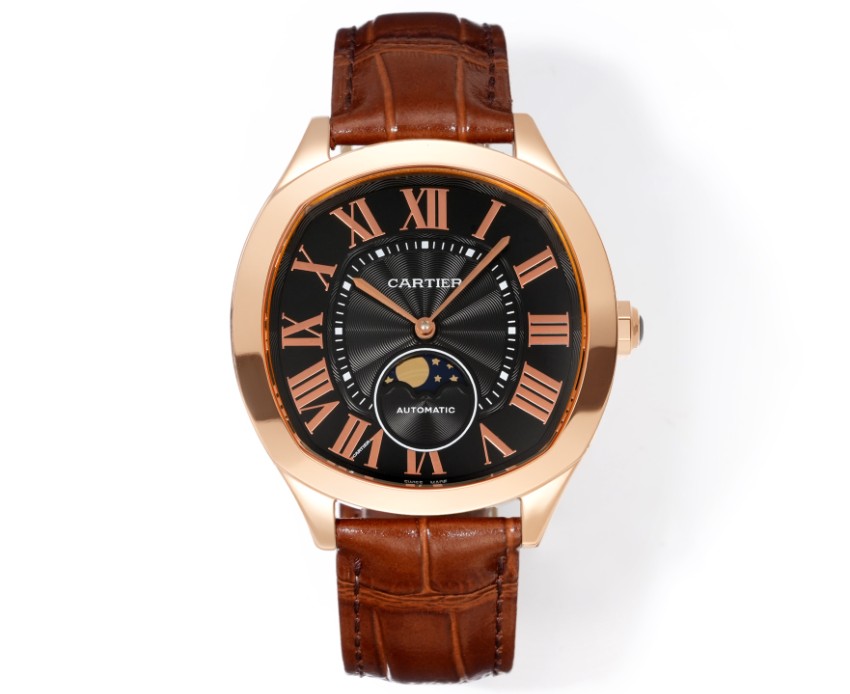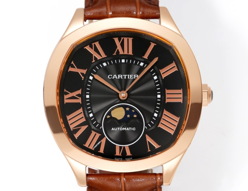 クラシックな美しさとモダンな輝きを融合させた、カルティエ風自動巻きムーンフェイズ腕時計。スーパーコピー 優良店が厳選する高再現度モデルで、漆黒の文字盤にローズゴールドのインデックスが高級感を放ちます。中央のギョーシェ彫りが繊細な陰影を生み、6時位置のムーンフェイズが夜空のような神秘的な輝きを演出。艶やかなブラウンレザーベルトが上品さを際立たせ、ビジネスにもフォーマルにも最適。高評価レビュー多数のスーパーコピー 優良店で、2025年新作として注目を集める極上の1本です。