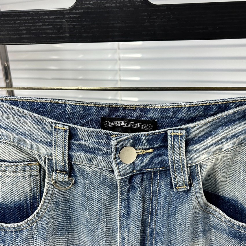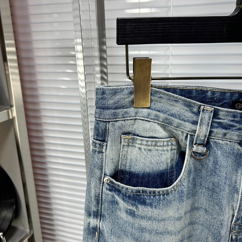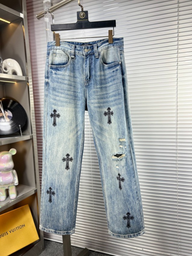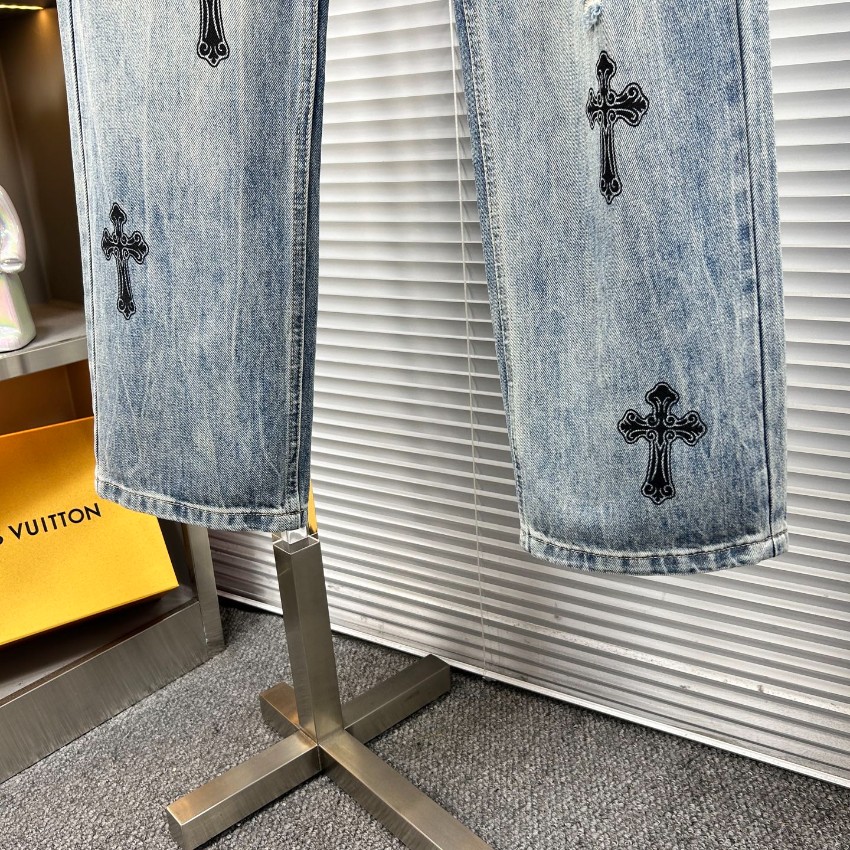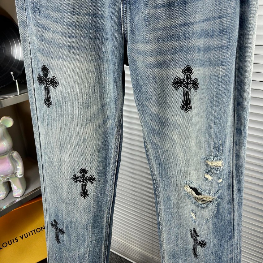 2025新作n級モデルとして登場したクロムハーツ風ライトブルーデニムは、ブランドらしいクロス刺繍を全体に配置したラグジュアリーな一本。繊細な刺繍ディテールとナチュラルな色落ち加工が組み合わさり、ヴィンテージ感と高級感を両立。軽やかな素材感ながらしっかりとしたハリがあり、シルエットを美しく保ちます。適度なダメージがこなれた印象を与え、ストリートスタイルからモードコーデまで幅広く対応。ライトブルーの発色が爽やかで、季節を問わず使える万能デニムです。n級ながら上質な縫製とディテールで、本格派にも満足できる完成度を誇ります。