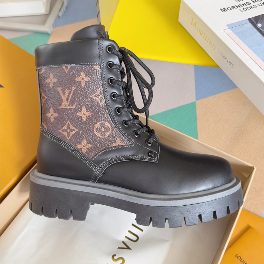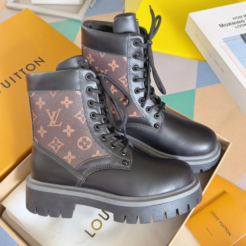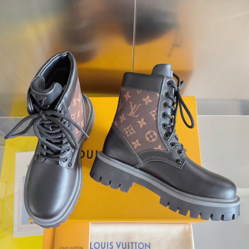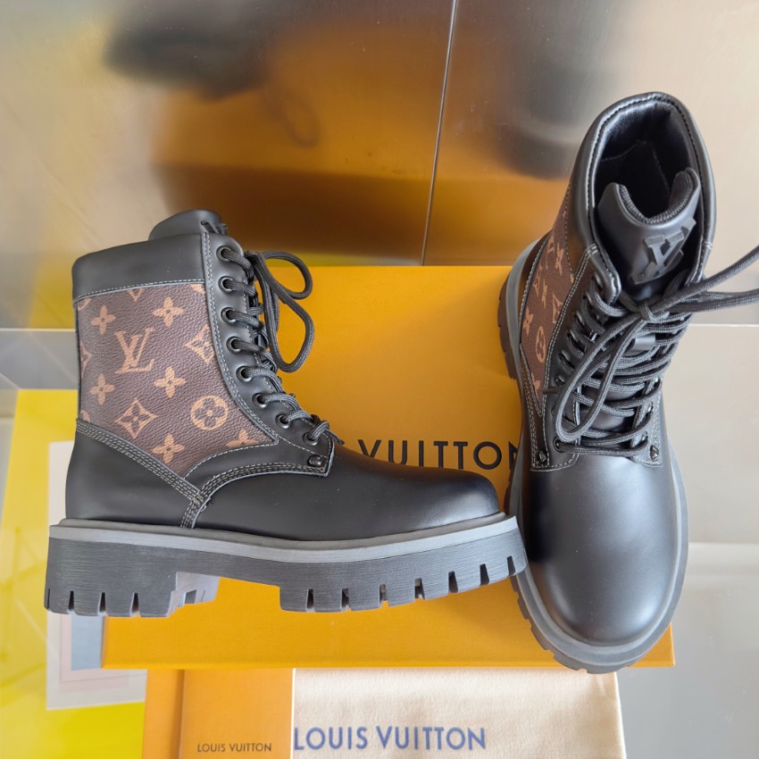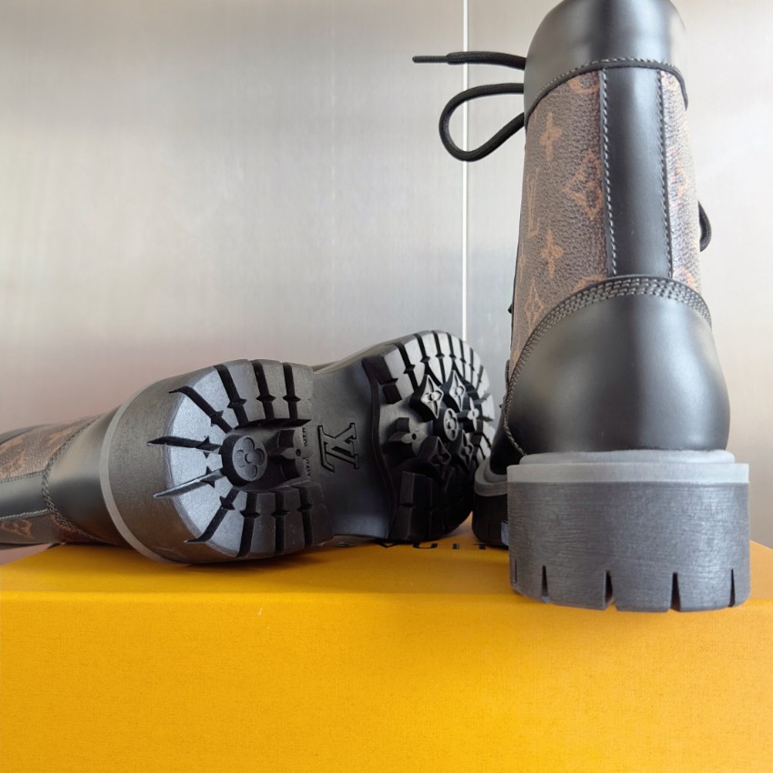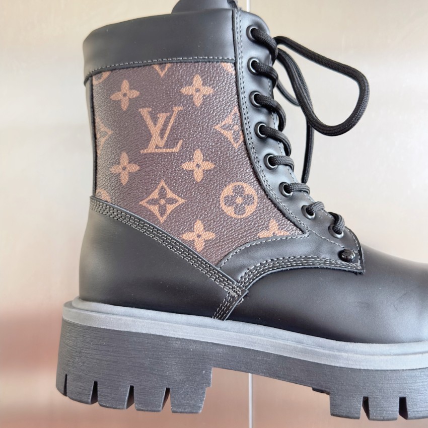実物と見分けがつかないと話題の本商品は、質感・デザイン共に秀逸です。ブラウン×ブラックのモノグラムパネルが印象的で、ルイ・ヴィトンらしい上質感を演出。厚めのアウトソールは安定感と防滑性に優れ、長時間の着用でも疲れにくい仕様です。高品質レザーの質感は柔らかく足馴染みが良く、履くほどに味わいが増します。購入者からは「高再現度で本物級」「激安価格なのに縫製がしっかり」と高評価レビュー多数。上品さと存在感を兼ね備えたブーツとして、シーズン問わず幅広く活躍します。