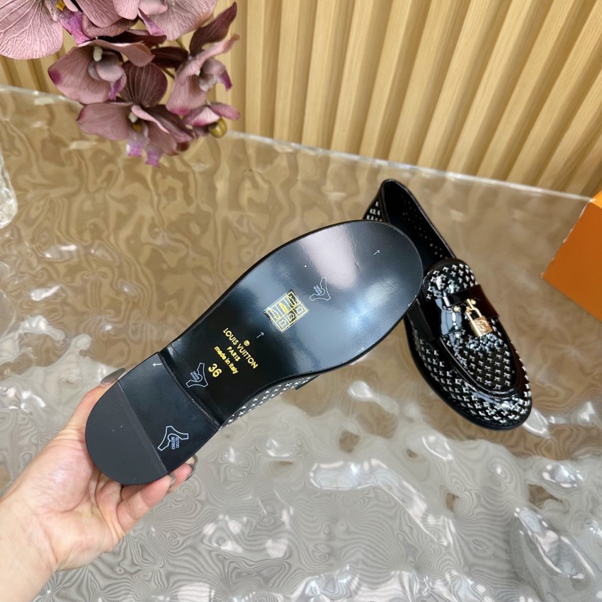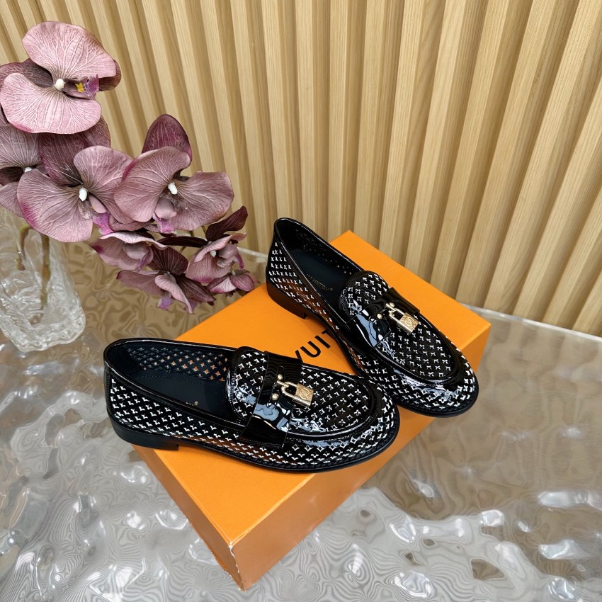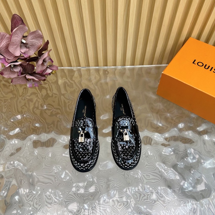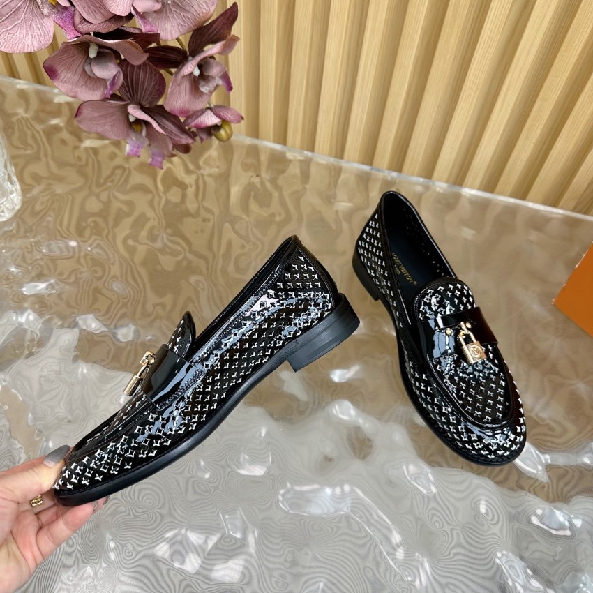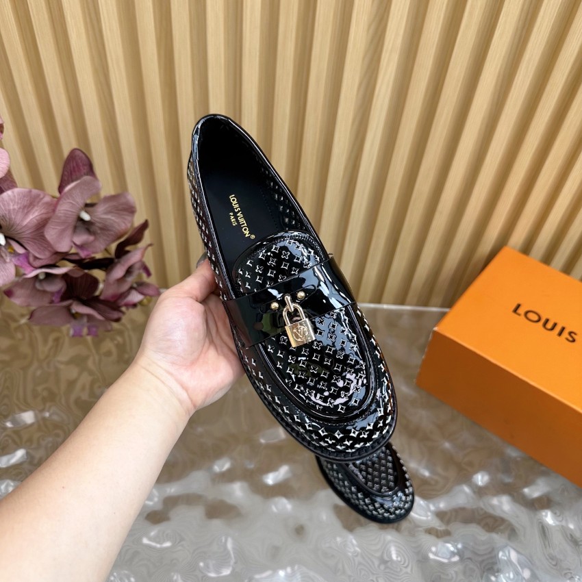 高再現度で仕上げた本モデルは、細部のクオリティにこだわった一足です。艶やかなブラックパテントレザーにモノグラム調パターンを施し、ラグジュアリーな印象を与えます。中央のロック金具が上品なアクセントとなり、足元に程よい華やかさをプラス。滑らかなインソールが足にフィットし、履き心地の良さでも高評価。購入者からは「激安価格なのに高級感がすごい」「リピート確定の仕上がり」と好評レビュー多数。レビュー高リピ率を誇るルイ・ヴィトン ローファーとして、日常使いにも特別なシーンにも最適な本格派モデルです。