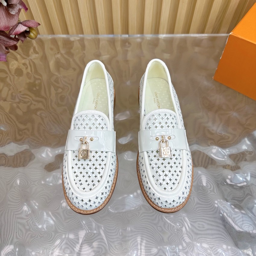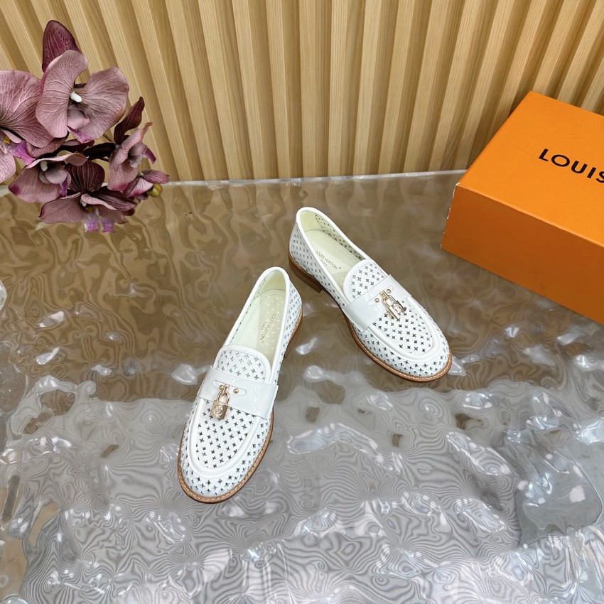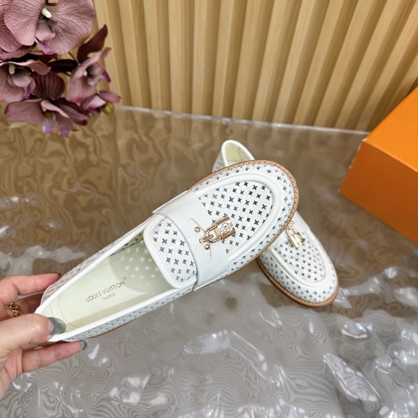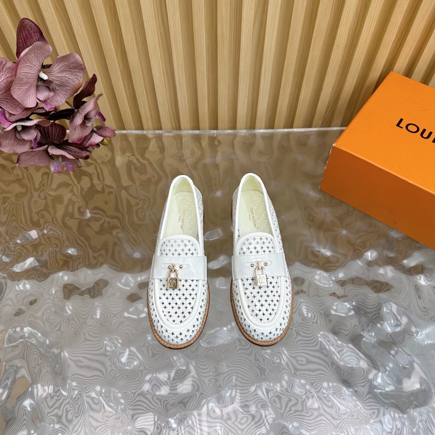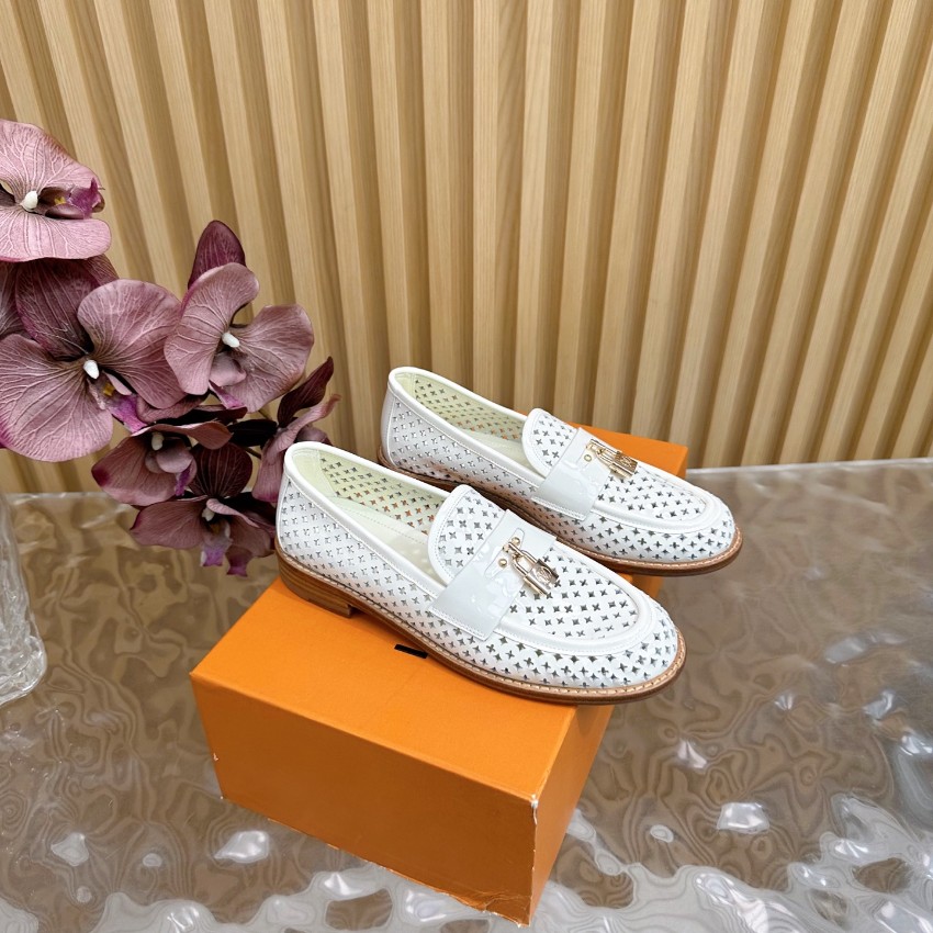 洗練されたシルエットと快適な着心地が特徴の一点です。ホワイトパテントレザーに通気性のあるパーフォレーションを施し、軽やかで清楚な印象を演出。フロントのゴールドロック金具が高級感を引き立て、オン・オフ問わず使いやすい万能ローファーに仕上がっています。インソールは柔らかく、長時間歩いても疲れにくい構造。購入者からは「ブランド コピーとは思えない完成度」「夏でも蒸れにくく快適」と高評価レビュー多数。上質な素材と職人技術による高再現度モデルで、スタイルと快適さを両立したルイ・ヴィトンの人気アイテムです。