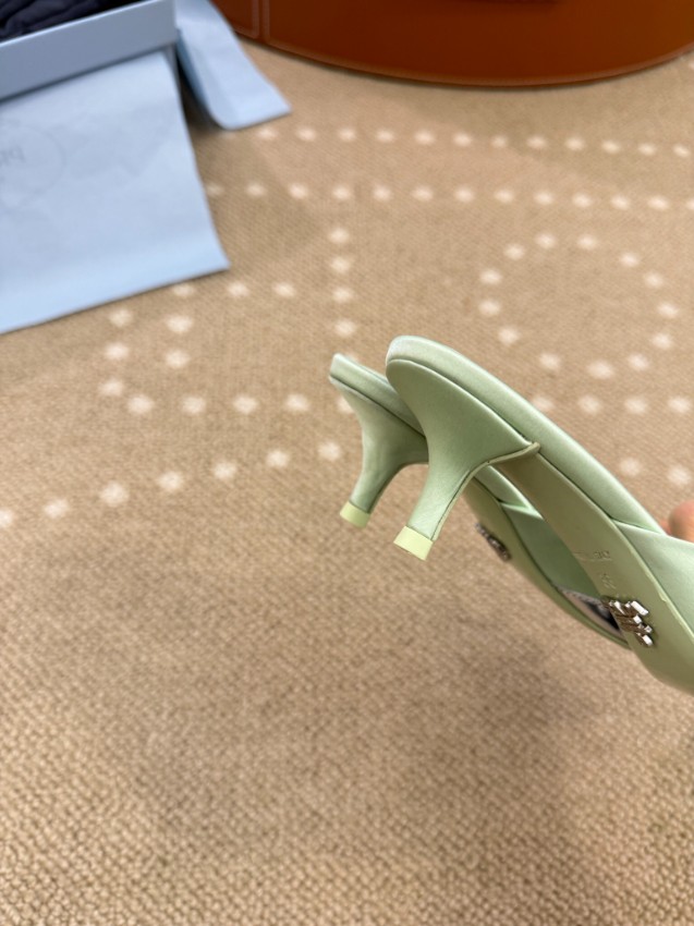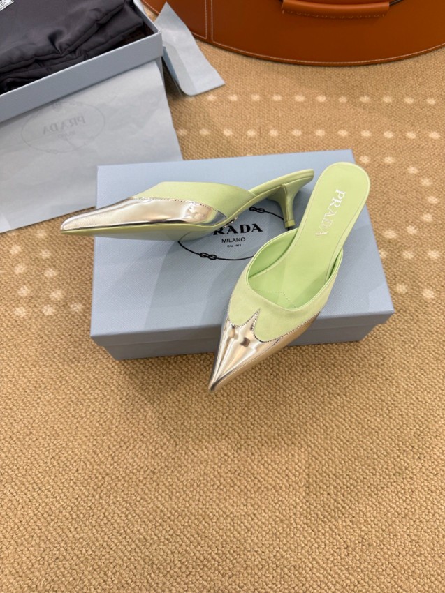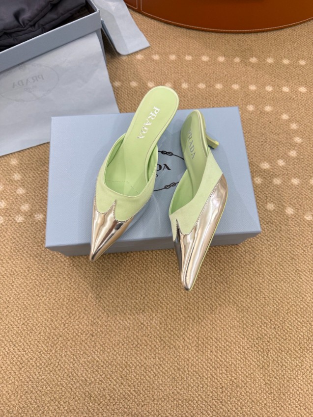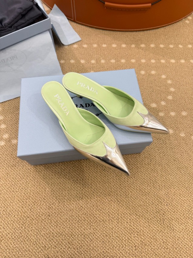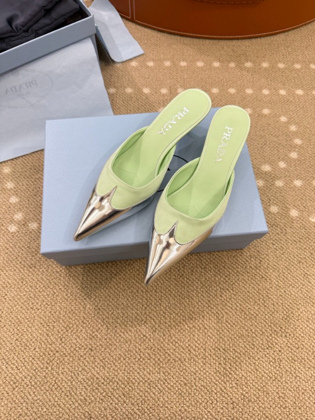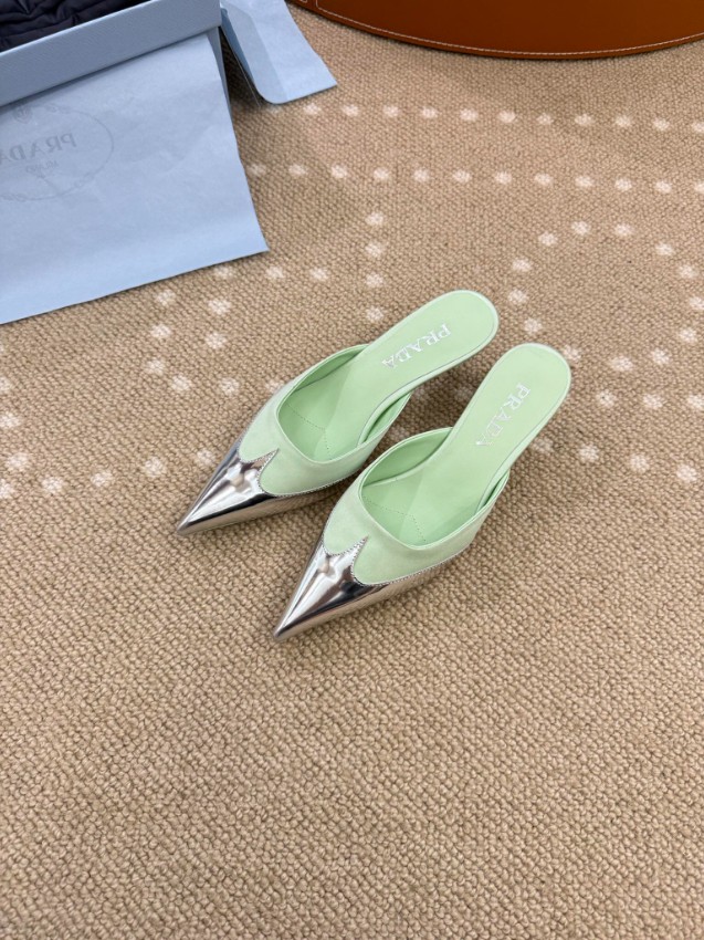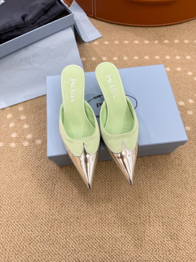 プラダ ハイブランドのポインテッドトゥミュールパンプスは、爽やかなパステルグリーンとメタリックトゥの組み合わせが魅力的なモデルです。シャープなシルエットが足元を美しく引き締め、軽やかなカラーリングがコーディネートに華やかな印象を加えます。ミュール仕様で着脱が簡単なうえ、フィット感にも優れ快適な履き心地を実現。フロントのメタルトゥと正確な刻印が細部までこだわりを感じさせ、高級感ある仕上がりとなっています。日常使いから特別なシーンまで幅広く活躍する洗練された一足です。