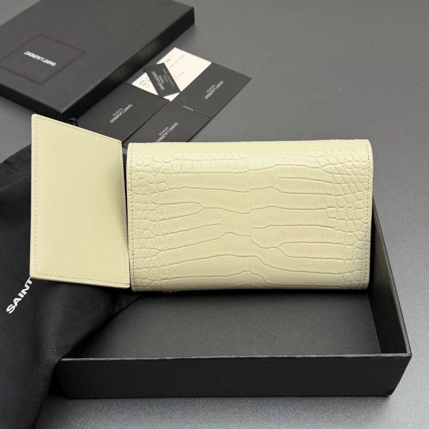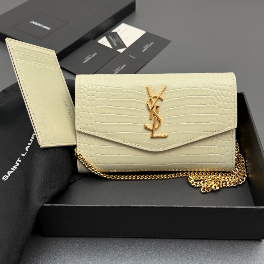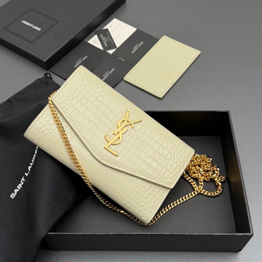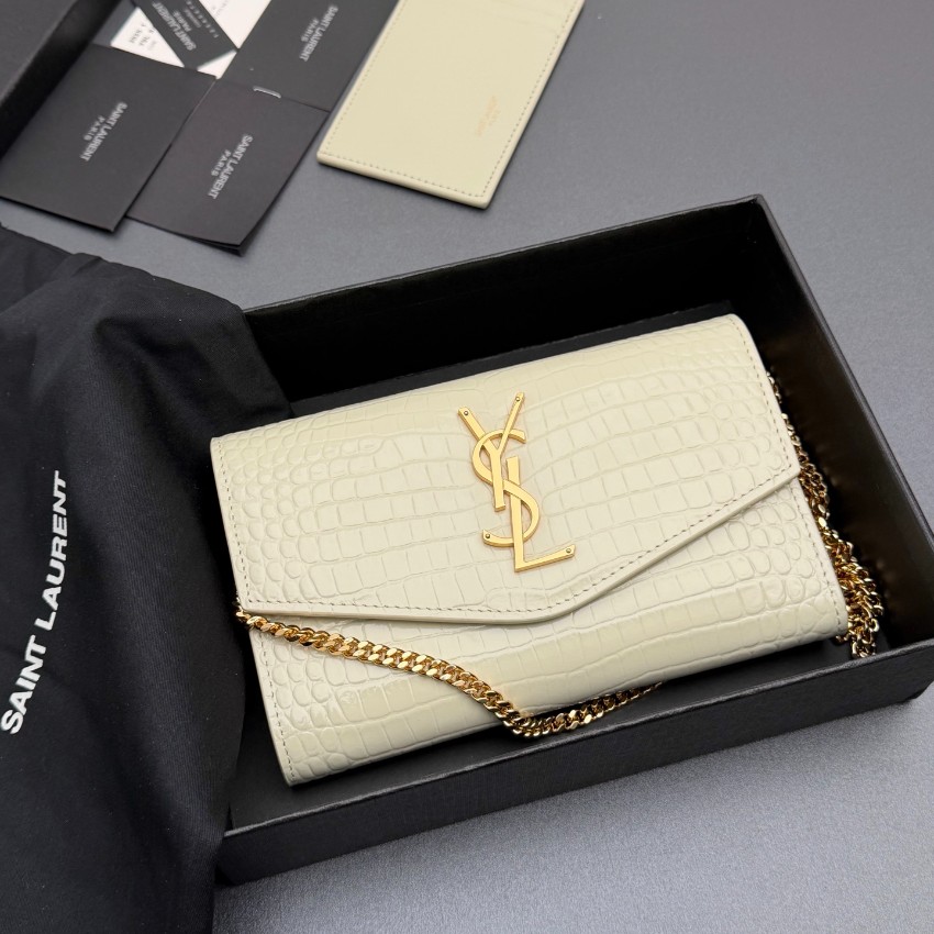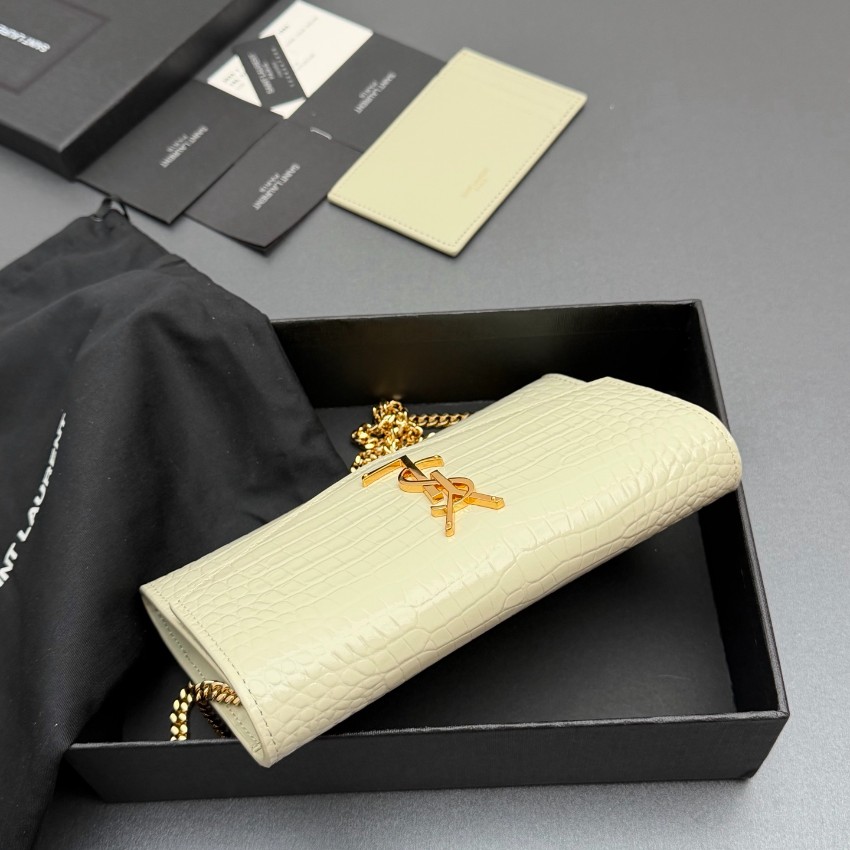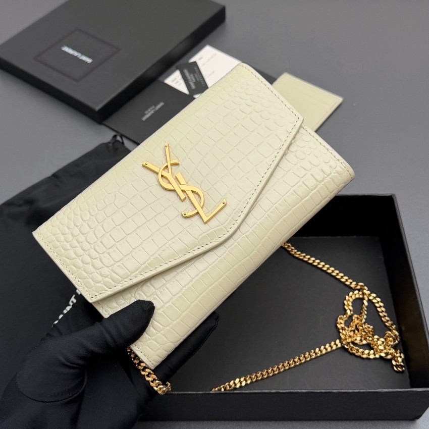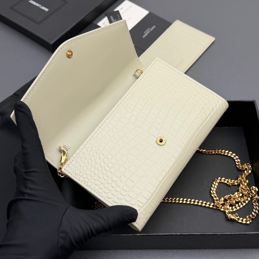 サンローランのエレガントな魅力を表現したスーパーコピーのチェーンウォレットは、クロコ型押しレザーの繊細な質感と美しい光沢が特徴です。中央に配置されたYSLロゴが存在感を放ち、シンプルながらも高級感あふれるデザインに仕上がっています。内側はカードや紙幣を整理しやすい実用的な構造で、使い勝手も抜群。ゴールドチェーンがアクセントとなり、ショルダーとしてもクラッチとしても使用できる便利な2WAY仕様です。細部まで丁寧に仕上げられた上質感により、日常のスタイルを格上げする一品です。